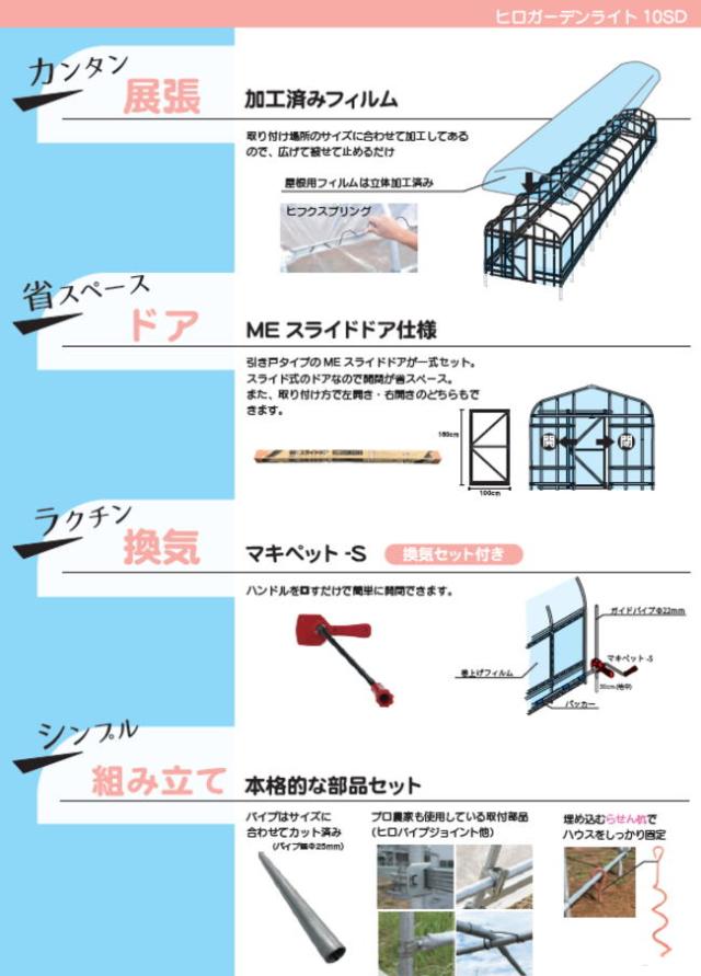 | ・ワイドに栽培!自分で組み立てられる園芸用ハウス ・パイプ+フィルム+部品一式がセットとなっており、ヒロガーデンライト10SD用に 加工されているので、簡単にハウスを立てる事ができます。 ・屋根のフィルムはハウスの形に合わせた立体加工で被せるだけの簡単施工となっております。 ・間口3.6m、奥行も9.1mと大きく、ハウス内の高さも2m以上と作業時も快適です。 ・温度管理等に便利な換気セット(左右)を標準装備 ・引き戸タイプのMEスライドドアが一式セット スライド式のドアなので開閉が省スペース。また、取り付け方で左開き、右開きのどちらでもできます。 |