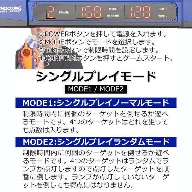 【 ナーフ 電子ターゲット 】ターゲットを設置し直す手間がないので、撃つことだけに専念できます。ターゲットを倒すたびに「スギャン!」「パリーン!」と効果音が鳴るのもポイントです!「シングルプレイノーマルモード」「シングルプレイランダムモード」「マルチプレイノーマルモード」「マルチプレイランダムモード」4種類のプレイモード機能があります。お一人で遊べるのはもちろん、家族やお友達と対戦して楽しむことも可能です!