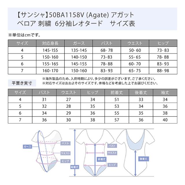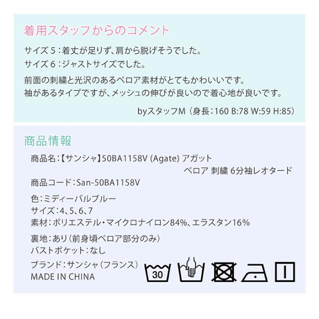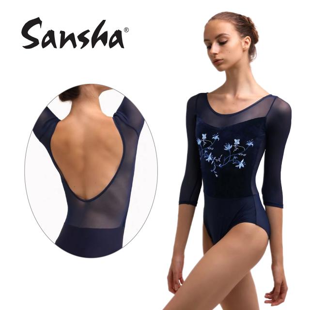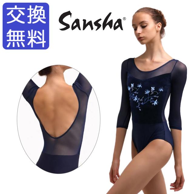 バレエ レオタード 【サンシャ】50BA1158V (Agate) アガット ベロア 刺繍 6分袖 レオタード 大人 ジュニア メッシュ おしゃれ ストレッチ 伸縮 花柄 レッスン 練習 着 透け感 シンプル デコルテ きれい ネイビー 紺 Vネック 145 150 155 160 165 170