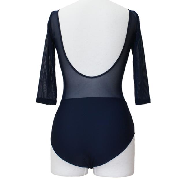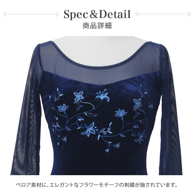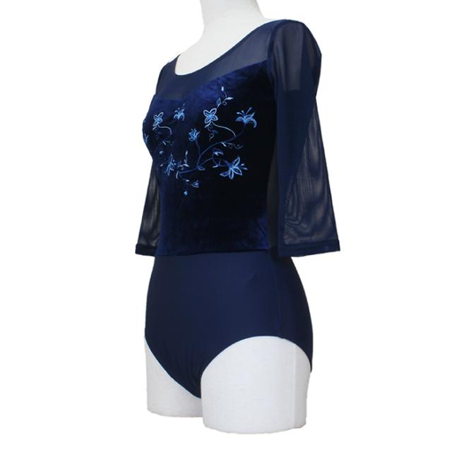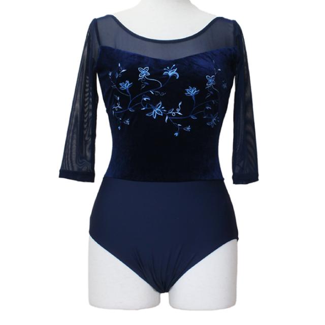 【色サイズ交換無料】ベロアとメッシュの合わせ使いが綺麗 肘より少し長めの6分袖 バレエレオタード。可愛い花柄の刺繍 練習着 バレエウェア 紺 ネイビー おとな ジュニア