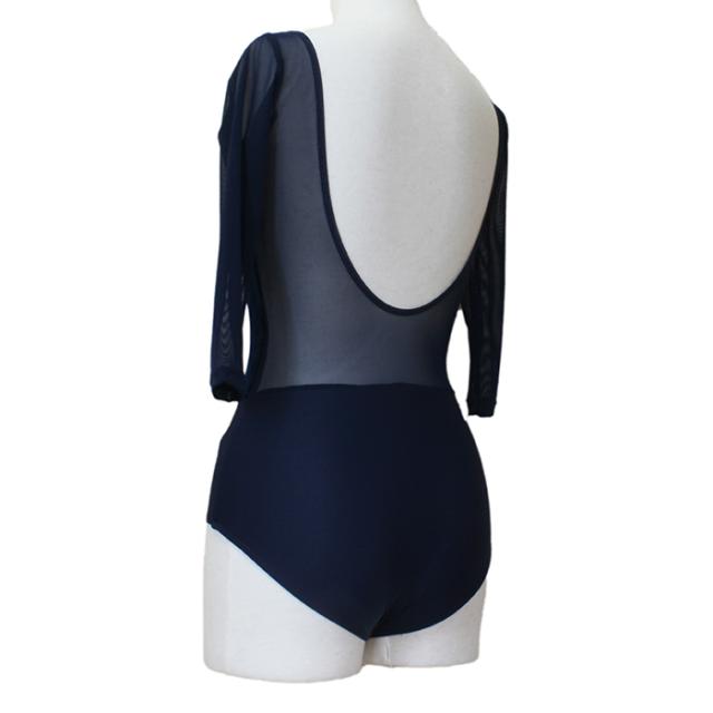 異素材の組み合わせとフラワーモチーフの刺繍が美しい、6分袖のレオタードです。