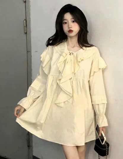 ミニワンピース 細見え 春夏 普段使い お出かけ デート アプリコット Vネック 無地 大人 カジュアル 清楚 可愛い レトロ キュート ゆったり Aライン 長袖 フリル ショート丈 人気 トレンド 10代 20代 30代