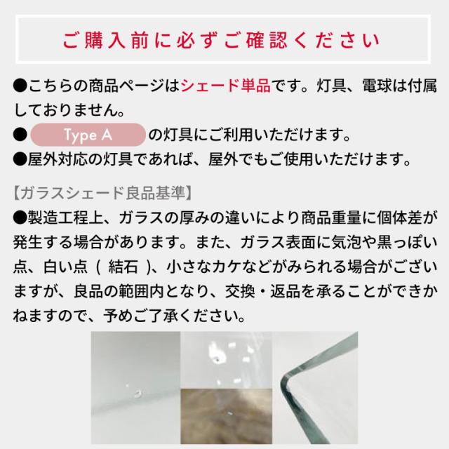 | 注意事項 | ※製造工程上、ガラスの厚みの違いにより商品重量に個体差が発生する場合があります。 ※光源が目に入りやすいので、吊るす高さや場所を工夫して、眩しく感じないちょうどいい位置にご調整ください。 ※こちらはシェードのみの商品です。照明としてお使いいただくには、別途「灯具」と「電球」のご購入が必要となります。アクシスのシェードはアクシスの灯具とセットでのご利用を想定しておりますので、関連商品のリンクを参考にしていただき、灯具と電球をご用意ください。 |