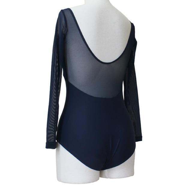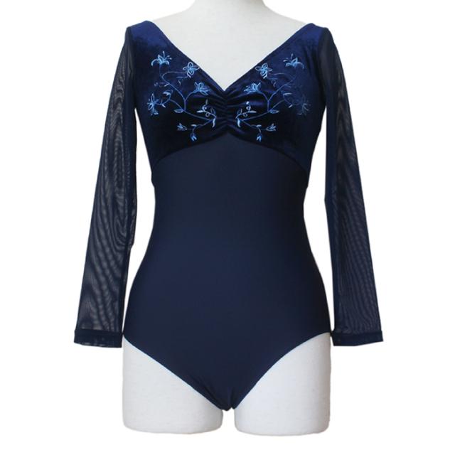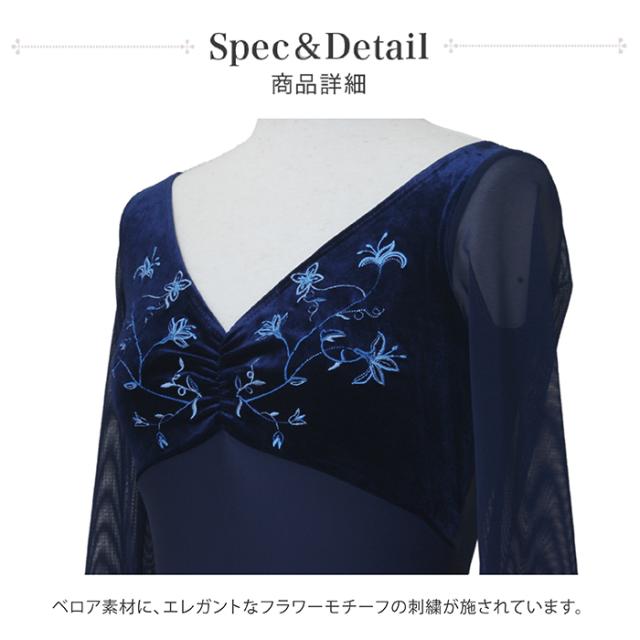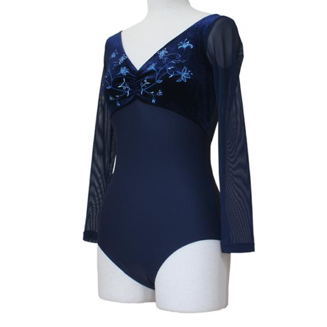 異素材の組み合わせとフラワーモチーフの刺繍が美しい、長袖のレオタードです。