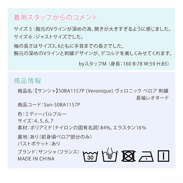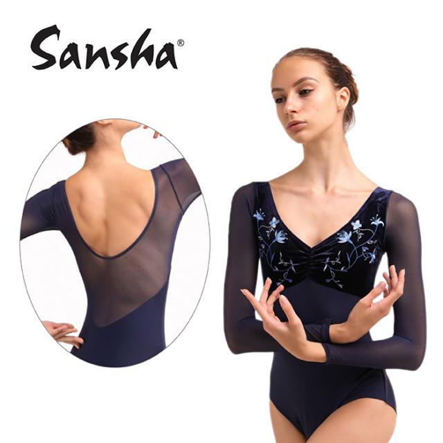 バレエ レオタード 【サンシャ】 50BA1157P (Veronique) ヴェロニック ベロア 刺繍 長袖 レオタード 大人 ジュニア メッシュ おしゃれ ストレッチ 伸縮 花柄 レッスン 練習 着 シンプル デコルテ きれい ネイビー 紺 Vネック 145 150 155 160 165 170