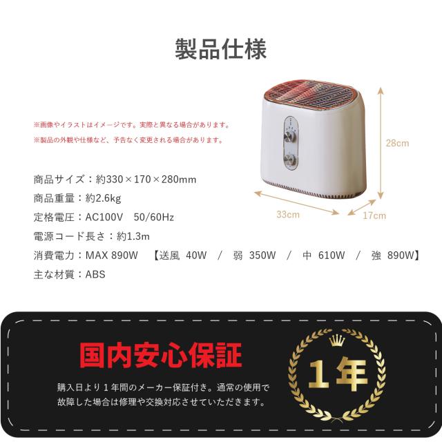 消費電力:MAX 890W 【送風 40W / 弱 350W / 中 610W / 強 890W】