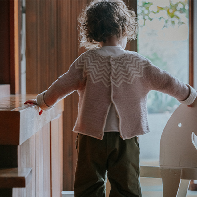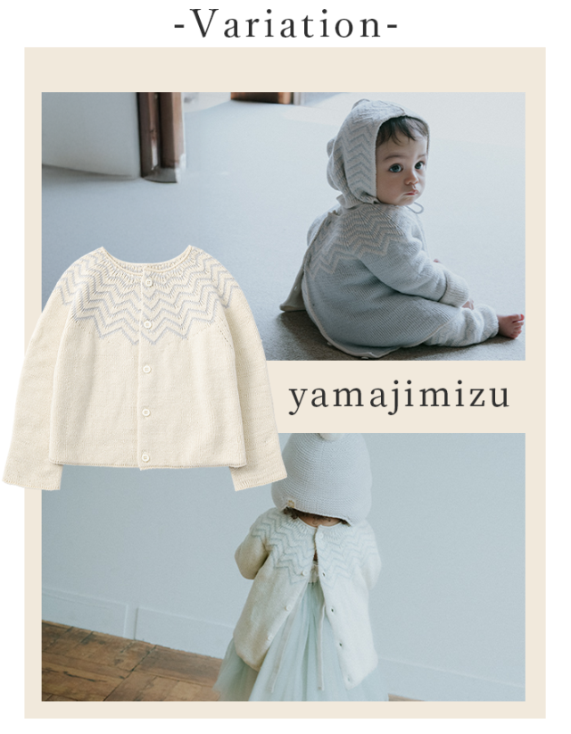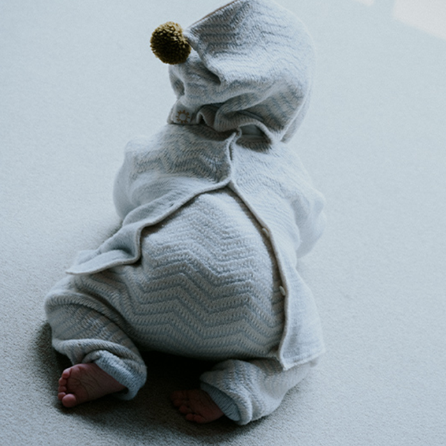 ボタンを背面にしてプルオーバーとして着用できます。縫い目のないホールガーメント製法を用いたことによりリバーシブルで着ることも。日本製の柔らかなニット素材が子どもを優しく包みます。