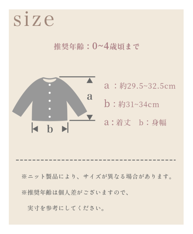 【サイズ】a:着丈 約29.5cm〜32.5cm b:身幅 約 31cm〜34cm 推奨年齢:0〜4歳まで