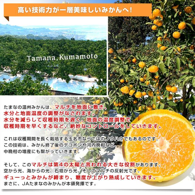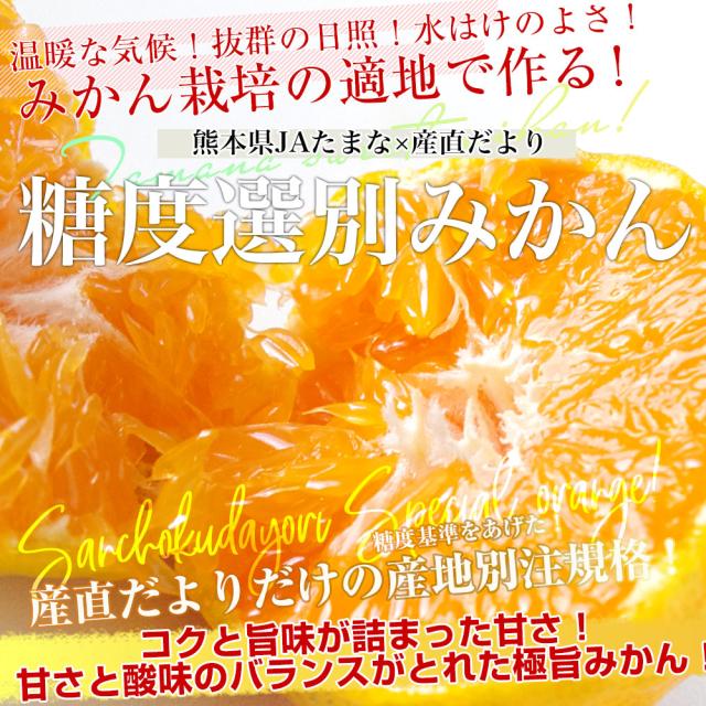 みかん栽培の最適地、熊本県JAたまなで作る、コクのある甘みの美味しいみかんをお届けします。1玉1玉、光センサーで糖度を測定し、一定の糖度基準を満たした、別注品のみかんですので、どれをとっても美味な味わいです。ぜひご賞味ください。