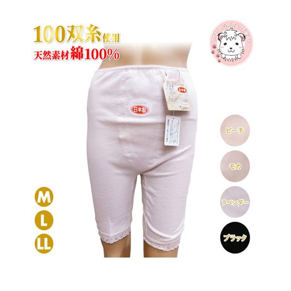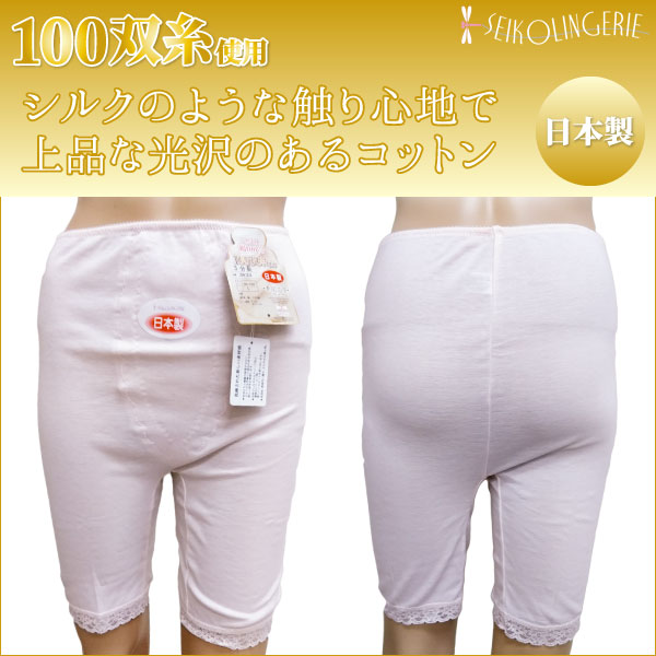 素肌に安心とやさしさの思いやり肌着。100双糸シリーズの3分長ボトムです。天然素材の綿100%!シルクのような触り心地で上品な光沢のあるコットンです。安心の日本製製品。