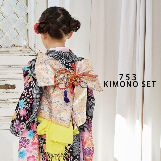 絵羽柄 四つ身 15点 フルセット 古典 鹿の子 疋田 黒 ピンク レトロ 7歳 七歳 女児 着物セット 七五三 お正月 ひな祭り 四ツ身 女の子 作り帯 筥迫セット