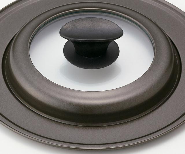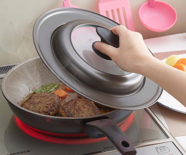 煮込み料理や蒸し料理などの際に活躍するフライパンの蓋です。ひとつで20〜26cmまでのフライパンに対応できます。3層の特殊被膜加工により、サビにくく耐久性に優れています。また、汚れがつきにくくお手入れも簡単です。