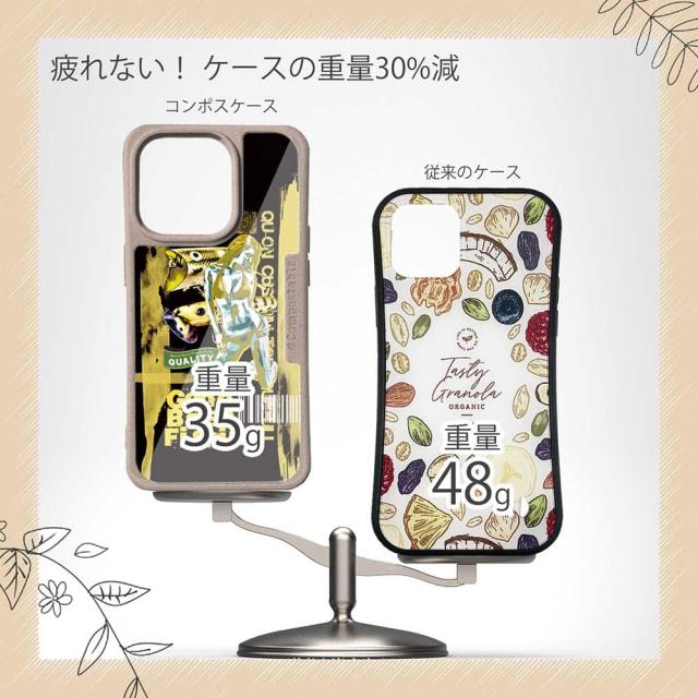| ケースについて | 背面の内側に入れ込むデザインシートで、シーンに合わせて着せ替え可能。また、グリップしやすいクッション構造で、本体重量は約35gと軽減化を実現。さらに衝撃に強いSライン形状、究極に押しやすいボタン設計(切り込みが入ることで押し込む力を軽減)、背面のカメラ・レンズを保護する高さ設計となっております。生分解性プラスチック素材ながらも着脱もしやすく、割れない・指紋防止加工を施しています。 |