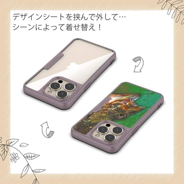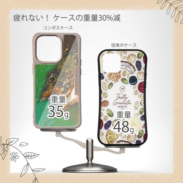 | ケースについて | 背面の内側に入れ込むデザインシートで、シーンに合わせて着せ替え可能。また、グリップしやすいクッション構造で、本体重量は約35gと軽減化を実現。さらに衝撃に強いSライン形状、究極に押しやすいボタン設計(切り込みが入ることで押し込む力を軽減)、背面のカメラ・レンズを保護する高さ設計となっております。生分解性プラスチック素材ながらも着脱もしやすく、割れない・指紋防止加工を施しています。 |