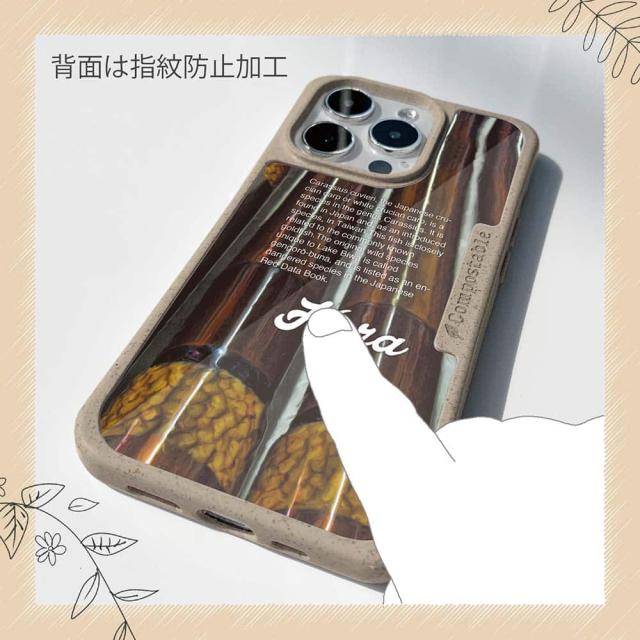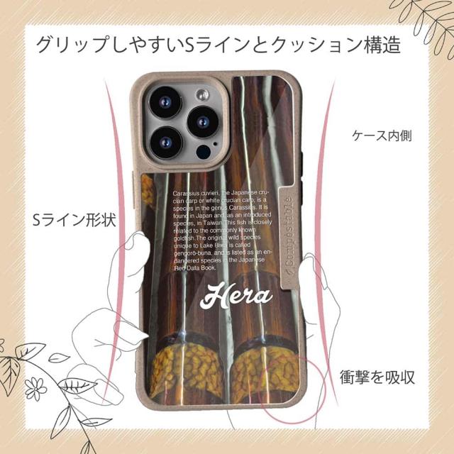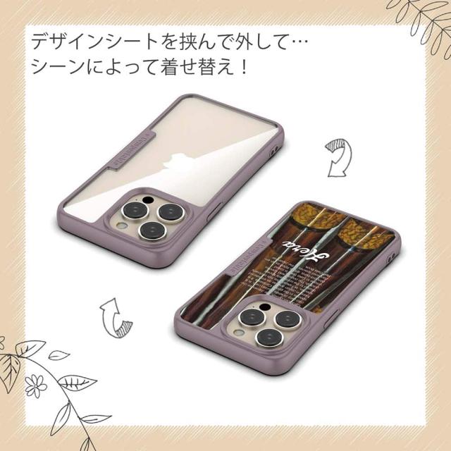 | ケースについて | 背面の内側に入れ込むデザインシートで、シーンに合わせて着せ替え可能。また、グリップしやすいクッション構造で、本体重量は約35gと軽減化を実現。さらに衝撃に強いSライン形状、究極に押しやすいボタン設計(切り込みが入ることで押し込む力を軽減)、背面のカメラ・レンズを保護する高さ設計となっております。生分解性プラスチック素材ながらも着脱もしやすく、割れない・指紋防止加工を施しています。 |