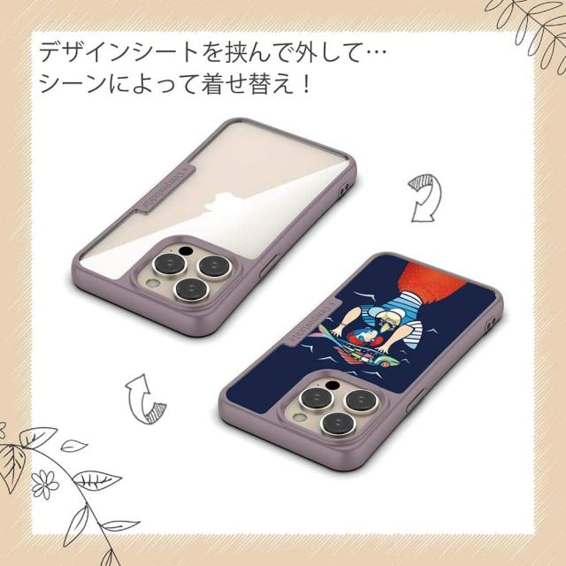 | ケースについて | 背面の内側に入れ込むデザインシートで、シーンに合わせて着せ替え可能。また、グリップしやすいクッション構造で、本体重量は約35gと軽減化を実現。さらに衝撃に強いSライン形状、究極に押しやすいボタン設計(切り込みが入ることで押し込む力を軽減)、背面のカメラ・レンズを保護する高さ設計となっております。生分解性プラスチック素材ながらも着脱もしやすく、割れない・指紋防止加工を施しています。 |