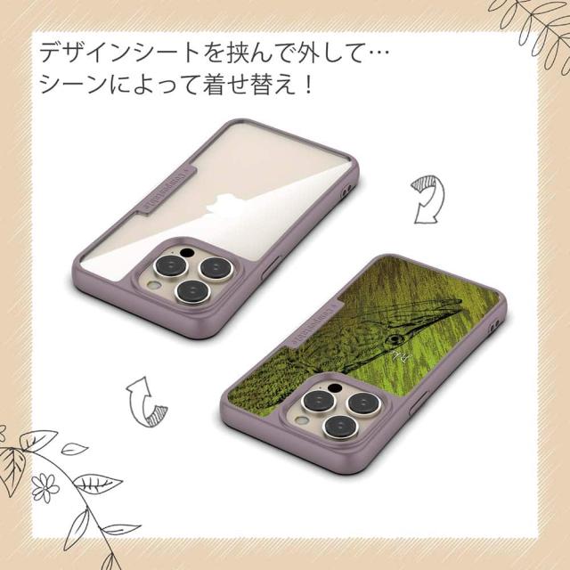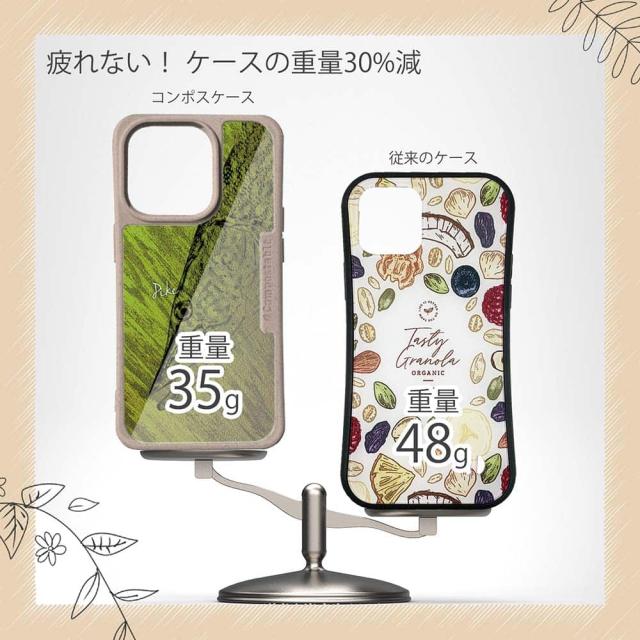 | ケースについて | 背面の内側に入れ込むデザインシートで、シーンに合わせて着せ替え可能。また、グリップしやすいクッション構造で、本体重量は約35gと軽減化を実現。さらに衝撃に強いSライン形状、究極に押しやすいボタン設計(切り込みが入ることで押し込む力を軽減)、背面のカメラ・レンズを保護する高さ設計となっております。生分解性プラスチック素材ながらも着脱もしやすく、割れない・指紋防止加工を施しています。 |