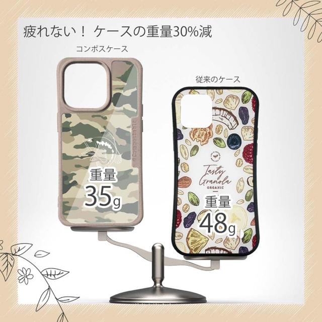 | ケースについて | 背面の内側に入れ込むデザインシートで、シーンに合わせて着せ替え可能。また、グリップしやすいクッション構造で、本体重量は約35gと軽減化を実現。さらに衝撃に強いSライン形状、究極に押しやすいボタン設計(切り込みが入ることで押し込む力を軽減)、背面のカメラ・レンズを保護する高さ設計となっております。生分解性プラスチック素材ながらも着脱もしやすく、割れない・指紋防止加工を施しています。 |