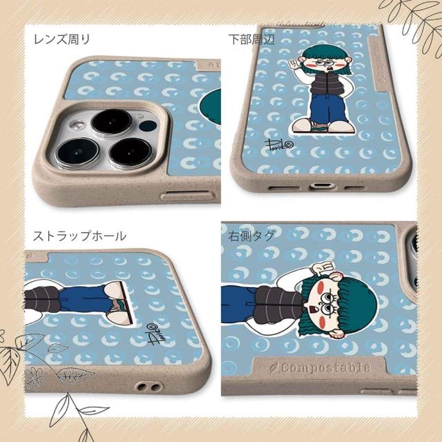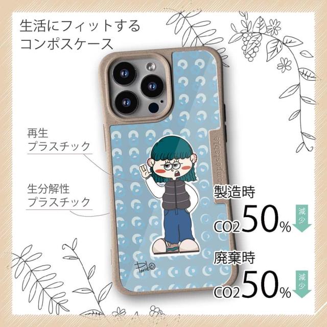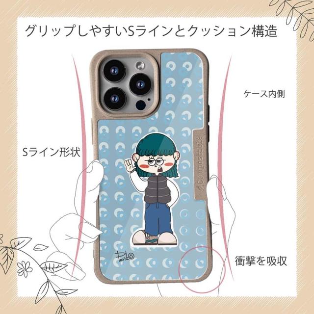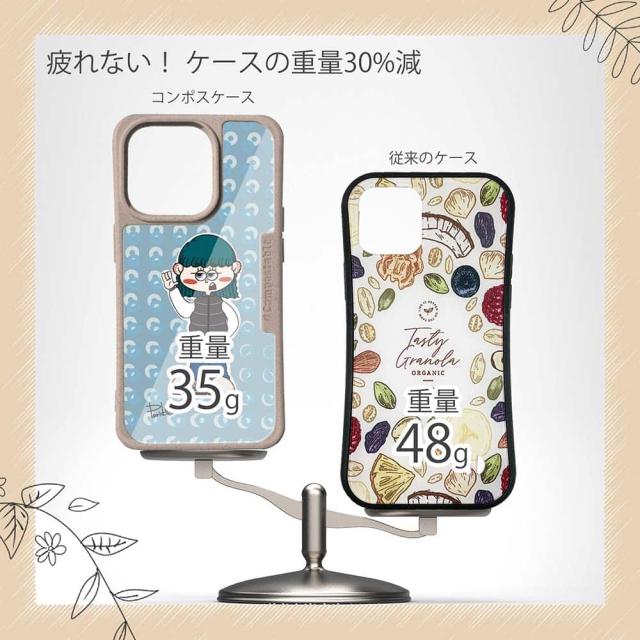 | ケースについて | 背面の内側に入れ込むデザインシートで、シーンに合わせて着せ替え可能。また、グリップしやすいクッション構造で、本体重量は約35gと軽減化を実現。さらに衝撃に強いSライン形状、究極に押しやすいボタン設計(切り込みが入ることで押し込む力を軽減)、背面のカメラ・レンズを保護する高さ設計となっております。生分解性プラスチック素材ながらも着脱もしやすく、割れない・指紋防止加工を施しています。 |