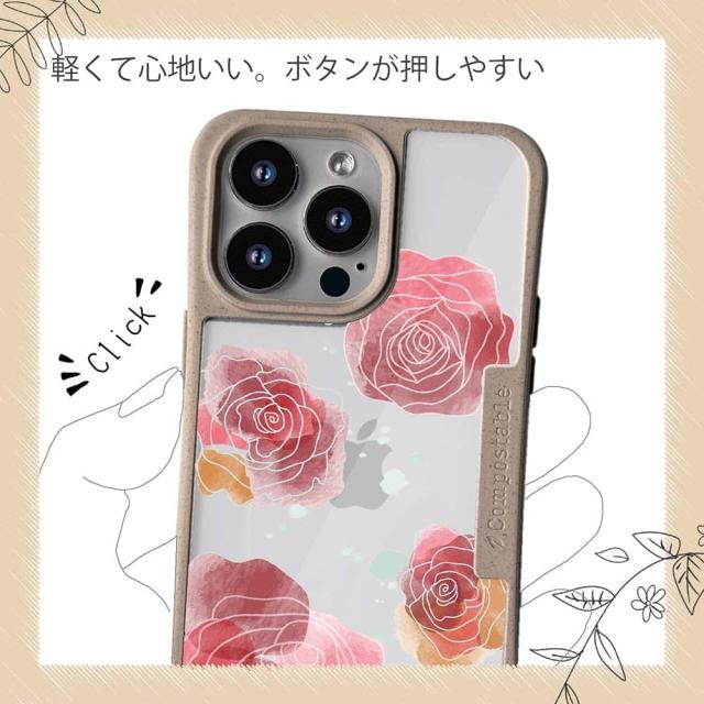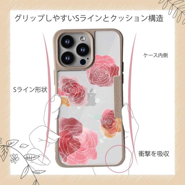 | ケースについて | 背面の内側に入れ込むデザインシートで、シーンに合わせて着せ替え可能。また、グリップしやすいクッション構造で、本体重量は約35gと軽減化を実現。さらに衝撃に強いSライン形状、究極に押しやすいボタン設計(切り込みが入ることで押し込む力を軽減)、背面のカメラ・レンズを保護する高さ設計となっております。生分解性プラスチック素材ながらも着脱もしやすく、割れない・指紋防止加工を施しています。 |