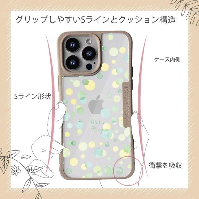| ケースについて | 背面の内側に入れ込むデザインシートで、シーンに合わせて着せ替え可能。また、グリップしやすいクッション構造で、本体重量は約35gと軽減化を実現。さらに衝撃に強いSライン形状、究極に押しやすいボタン設計(切り込みが入ることで押し込む力を軽減)、背面のカメラ・レンズを保護する高さ設計となっております。生分解性プラスチック素材ながらも着脱もしやすく、割れない・指紋防止加工を施しています。 |