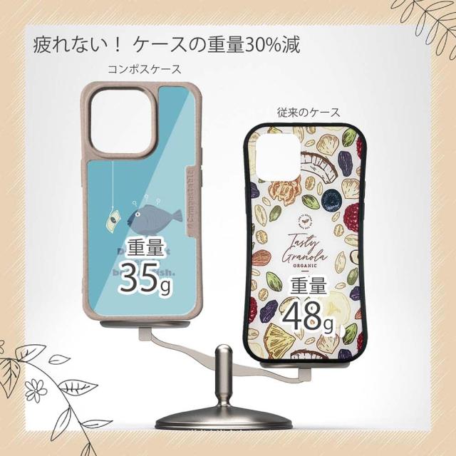 | ケースについて | 背面の内側に入れ込むデザインシートで、シーンに合わせて着せ替え可能。また、グリップしやすいクッション構造で、本体重量は約35gと軽減化を実現。さらに衝撃に強いSライン形状、究極に押しやすいボタン設計(切り込みが入ることで押し込む力を軽減)、背面のカメラ・レンズを保護する高さ設計となっております。生分解性プラスチック素材ながらも着脱もしやすく、割れない・指紋防止加工を施しています。 |