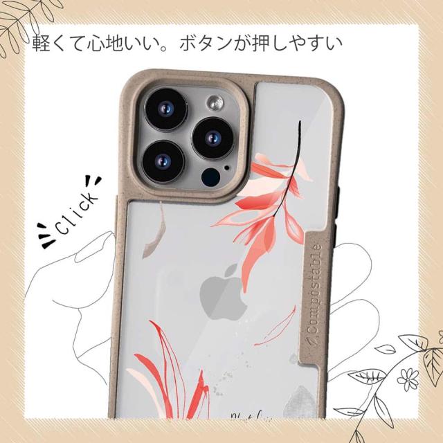 | ケースについて | 背面の内側に入れ込むデザインシートで、シーンに合わせて着せ替え可能。また、グリップしやすいクッション構造で、本体重量は約35gと軽減化を実現。さらに衝撃に強いSライン形状、究極に押しやすいボタン設計(切り込みが入ることで押し込む力を軽減)、背面のカメラ・レンズを保護する高さ設計となっております。生分解性プラスチック素材ながらも着脱もしやすく、割れない・指紋防止加工を施しています。 |