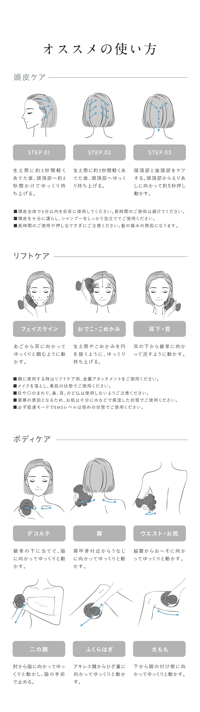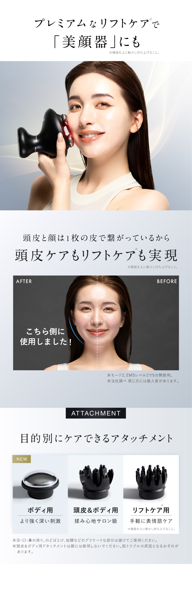 | セット内容 | 本体×1 充電台×1 頭皮&ボディ用アタッチメント×4(本体セット済) リフトケア用アタッチメント×4 金属アタッチメント×4 掃除用ブラシ×1 USB充電コード×1 ACアダプター×1 取扱説明書兼保証書×1 |