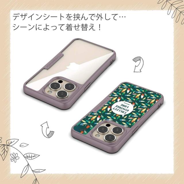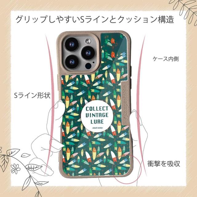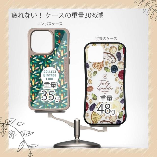| ケースについて | 背面の内側に入れ込むデザインシートで、シーンに合わせて着せ替え可能。また、グリップしやすいクッション構造で、本体重量は約35gと軽減化を実現。さらに衝撃に強いSライン形状、究極に押しやすいボタン設計(切り込みが入ることで押し込む力を軽減)、背面のカメラ・レンズを保護する高さ設計となっております。生分解性プラスチック素材ながらも着脱もしやすく、割れない・指紋防止加工を施しています。 |