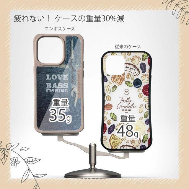 | ケースについて | 背面の内側に入れ込むデザインシートで、シーンに合わせて着せ替え可能。また、グリップしやすいクッション構造で、本体重量は約35gと軽減化を実現。さらに衝撃に強いSライン形状、究極に押しやすいボタン設計(切り込みが入ることで押し込む力を軽減)、背面のカメラ・レンズを保護する高さ設計となっております。生分解性プラスチック素材ながらも着脱もしやすく、割れない・指紋防止加工を施しています。 |