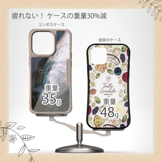 | ケースについて | 背面の内側に入れ込むデザインシートで、シーンに合わせて着せ替え可能。また、グリップしやすいクッション構造で、本体重量は約35gと軽減化を実現。さらに衝撃に強いSライン形状、究極に押しやすいボタン設計(切り込みが入ることで押し込む力を軽減)、背面のカメラ・レンズを保護する高さ設計となっております。生分解性プラスチック素材ながらも着脱もしやすく、割れない・指紋防止加工を施しています。 |