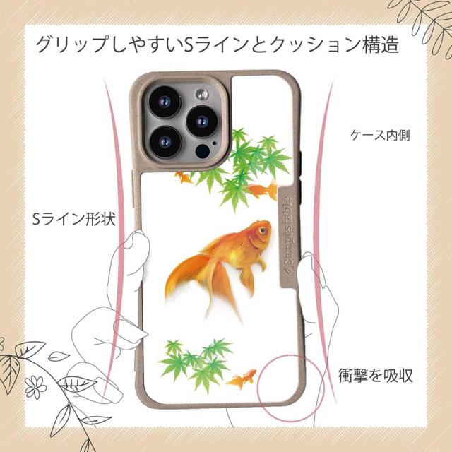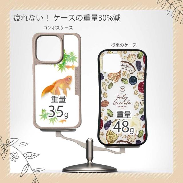 | ケースについて | 背面の内側に入れ込むデザインシートで、シーンに合わせて着せ替え可能。また、グリップしやすいクッション構造で、本体重量は約35gと軽減化を実現。さらに衝撃に強いSライン形状、究極に押しやすいボタン設計(切り込みが入ることで押し込む力を軽減)、背面のカメラ・レンズを保護する高さ設計となっております。生分解性プラスチック素材ながらも着脱もしやすく、割れない・指紋防止加工を施しています。 |