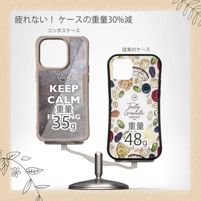 | ケースについて | 背面の内側に入れ込むデザインシートで、シーンに合わせて着せ替え可能。また、グリップしやすいクッション構造で、本体重量は約35gと軽減化を実現。さらに衝撃に強いSライン形状、究極に押しやすいボタン設計(切り込みが入ることで押し込む力を軽減)、背面のカメラ・レンズを保護する高さ設計となっております。生分解性プラスチック素材ながらも着脱もしやすく、割れない・指紋防止加工を施しています。 |