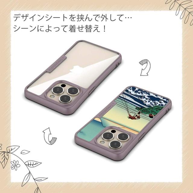 | ケースについて | 背面の内側に入れ込むデザインシートで、シーンに合わせて着せ替え可能。また、グリップしやすいクッション構造で、本体重量は約35gと軽減化を実現。さらに衝撃に強いSライン形状、究極に押しやすいボタン設計(切り込みが入ることで押し込む力を軽減)、背面のカメラ・レンズを保護する高さ設計となっております。生分解性プラスチック素材ながらも着脱もしやすく、割れない・指紋防止加工を施しています。 |