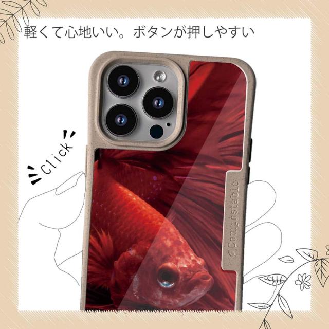 | ケースについて | 背面の内側に入れ込むデザインシートで、シーンに合わせて着せ替え可能。また、グリップしやすいクッション構造で、本体重量は約35gと軽減化を実現。さらに衝撃に強いSライン形状、究極に押しやすいボタン設計(切り込みが入ることで押し込む力を軽減)、背面のカメラ・レンズを保護する高さ設計となっております。生分解性プラスチック素材ながらも着脱もしやすく、割れない・指紋防止加工を施しています。 |