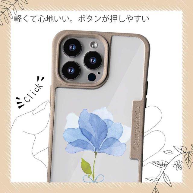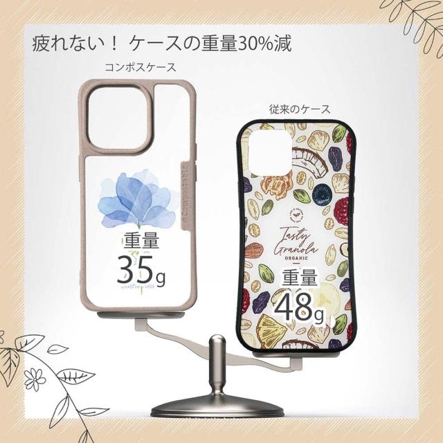 | ケースについて | 背面の内側に入れ込むデザインシートで、シーンに合わせて着せ替え可能。また、グリップしやすいクッション構造で、本体重量は約35gと軽減化を実現。さらに衝撃に強いSライン形状、究極に押しやすいボタン設計(切り込みが入ることで押し込む力を軽減)、背面のカメラ・レンズを保護する高さ設計となっております。生分解性プラスチック素材ながらも着脱もしやすく、割れない・指紋防止加工を施しています。 |