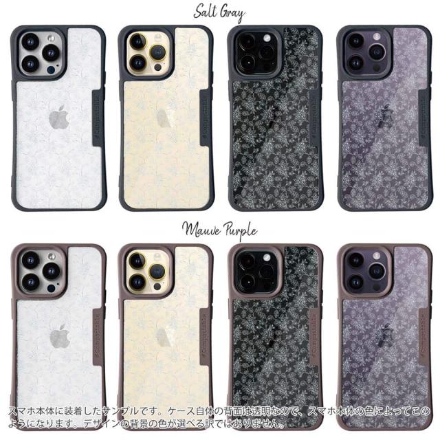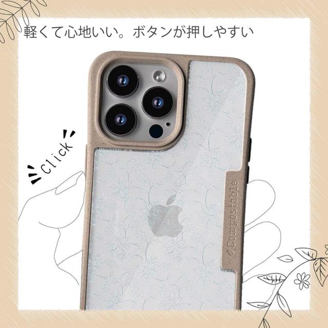 | ケースについて | 背面の内側に入れ込むデザインシートで、シーンに合わせて着せ替え可能。また、グリップしやすいクッション構造で、本体重量は約35gと軽減化を実現。さらに衝撃に強いSライン形状、究極に押しやすいボタン設計(切り込みが入ることで押し込む力を軽減)、背面のカメラ・レンズを保護する高さ設計となっております。生分解性プラスチック素材ながらも着脱もしやすく、割れない・指紋防止加工を施しています。 |