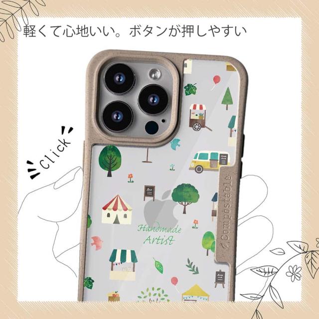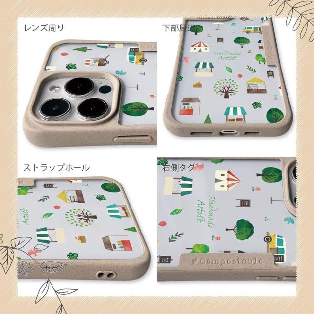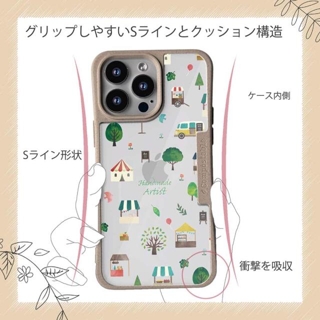 | ケースについて | 背面の内側に入れ込むデザインシートで、シーンに合わせて着せ替え可能。また、グリップしやすいクッション構造で、本体重量は約35gと軽減化を実現。さらに衝撃に強いSライン形状、究極に押しやすいボタン設計(切り込みが入ることで押し込む力を軽減)、背面のカメラ・レンズを保護する高さ設計となっております。生分解性プラスチック素材ながらも着脱もしやすく、割れない・指紋防止加工を施しています。 |