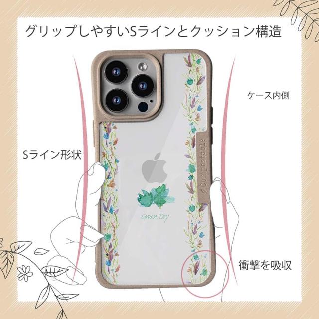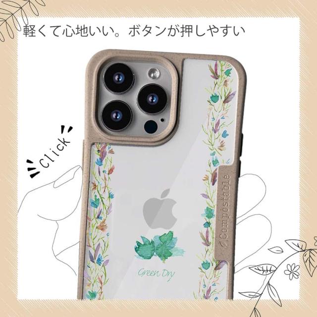 | ケースについて | 背面の内側に入れ込むデザインシートで、シーンに合わせて着せ替え可能。また、グリップしやすいクッション構造で、本体重量は約35gと軽減化を実現。さらに衝撃に強いSライン形状、究極に押しやすいボタン設計(切り込みが入ることで押し込む力を軽減)、背面のカメラ・レンズを保護する高さ設計となっております。生分解性プラスチック素材ながらも着脱もしやすく、割れない・指紋防止加工を施しています。 |