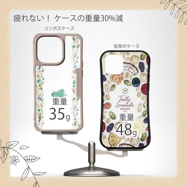 | 商品説明 | コンポスケースは、環境負荷低減を目的に開発されたスマホケース。従来のスマホケースと比べ、CO2排出量を50%削減できます。しかも、循環型社会に対応した素材を使ったケースです。 フレームカラーが4色からお選び頂けます。※コンポスケースとデザインシートが1つずつのセット商品となります。商品画像の15枚目と16枚目は、スマホの背景色によるサンプルです。ケース自体の背面は透明なので、スマホの背面色によってこのような色になるという例です。背景の色が選べる訳ではありませんので、予めご了承下さいませ。 シートのデザインは、水彩で描いたドライフラワー。今にも爽やかな香りに包まれそうなデザイン。シンプルでありながら飽きが来ない。 ![]() |