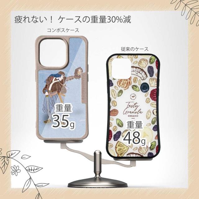 | ケースについて | 背面の内側に入れ込むデザインシートで、シーンに合わせて着せ替え可能。また、グリップしやすいクッション構造で、本体重量は約35gと軽減化を実現。さらに衝撃に強いSライン形状、究極に押しやすいボタン設計(切り込みが入ることで押し込む力を軽減)、背面のカメラ・レンズを保護する高さ設計となっております。生分解性プラスチック素材ながらも着脱もしやすく、割れない・指紋防止加工を施しています。 |