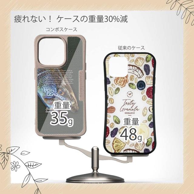 | ケースについて | 背面の内側に入れ込むデザインシートで、シーンに合わせて着せ替え可能。また、グリップしやすいクッション構造で、本体重量は約35gと軽減化を実現。さらに衝撃に強いSライン形状、究極に押しやすいボタン設計(切り込みが入ることで押し込む力を軽減)、背面のカメラ・レンズを保護する高さ設計となっております。生分解性プラスチック素材ながらも着脱もしやすく、割れない・指紋防止加工を施しています。 |