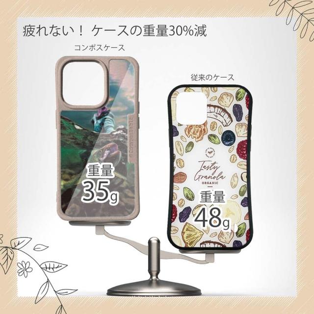 | ケースについて | 背面の内側に入れ込むデザインシートで、シーンに合わせて着せ替え可能。また、グリップしやすいクッション構造で、本体重量は約35gと軽減化を実現。さらに衝撃に強いSライン形状、究極に押しやすいボタン設計(切り込みが入ることで押し込む力を軽減)、背面のカメラ・レンズを保護する高さ設計となっております。生分解性プラスチック素材ながらも着脱もしやすく、割れない・指紋防止加工を施しています。 |