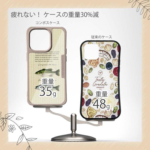 | ケースについて | 背面の内側に入れ込むデザインシートで、シーンに合わせて着せ替え可能。また、グリップしやすいクッション構造で、本体重量は約35gと軽減化を実現。さらに衝撃に強いSライン形状、究極に押しやすいボタン設計(切り込みが入ることで押し込む力を軽減)、背面のカメラ・レンズを保護する高さ設計となっております。生分解性プラスチック素材ながらも着脱もしやすく、割れない・指紋防止加工を施しています。 |