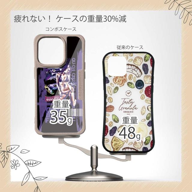 | ケースについて | 背面の内側に入れ込むデザインシートで、シーンに合わせて着せ替え可能。また、グリップしやすいクッション構造で、本体重量は約35gと軽減化を実現。さらに衝撃に強いSライン形状、究極に押しやすいボタン設計(切り込みが入ることで押し込む力を軽減)、背面のカメラ・レンズを保護する高さ設計となっております。生分解性プラスチック素材ながらも着脱もしやすく、割れない・指紋防止加工を施しています。 |