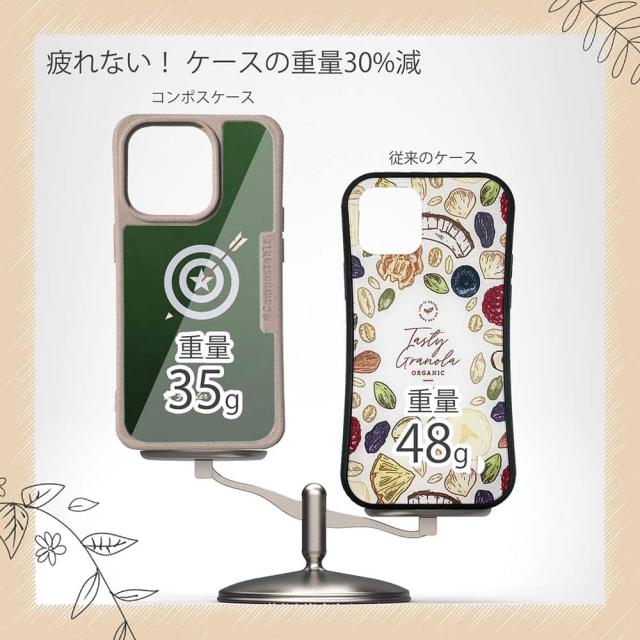 | ケースについて | 背面の内側に入れ込むデザインシートで、シーンに合わせて着せ替え可能。また、グリップしやすいクッション構造で、本体重量は約35gと軽減化を実現。さらに衝撃に強いSライン形状、究極に押しやすいボタン設計(切り込みが入ることで押し込む力を軽減)、背面のカメラ・レンズを保護する高さ設計となっております。生分解性プラスチック素材ながらも着脱もしやすく、割れない・指紋防止加工を施しています。 |