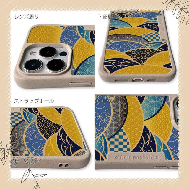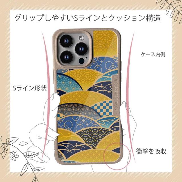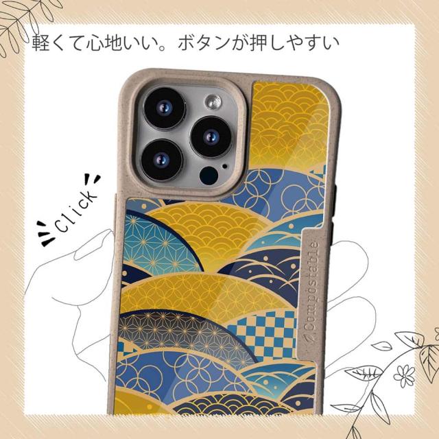 | ケースについて | 背面の内側に入れ込むデザインシートで、シーンに合わせて着せ替え可能。また、グリップしやすいクッション構造で、本体重量は約35gと軽減化を実現。さらに衝撃に強いSライン形状、究極に押しやすいボタン設計(切り込みが入ることで押し込む力を軽減)、背面のカメラ・レンズを保護する高さ設計となっております。生分解性プラスチック素材ながらも着脱もしやすく、割れない・指紋防止加工を施しています。 |