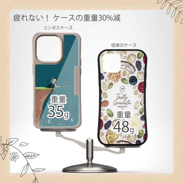 | ケースについて | 背面の内側に入れ込むデザインシートで、シーンに合わせて着せ替え可能。また、グリップしやすいクッション構造で、本体重量は約35gと軽減化を実現。さらに衝撃に強いSライン形状、究極に押しやすいボタン設計(切り込みが入ることで押し込む力を軽減)、背面のカメラ・レンズを保護する高さ設計となっております。生分解性プラスチック素材ながらも着脱もしやすく、割れない・指紋防止加工を施しています。 |