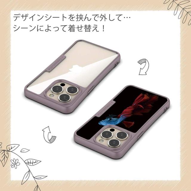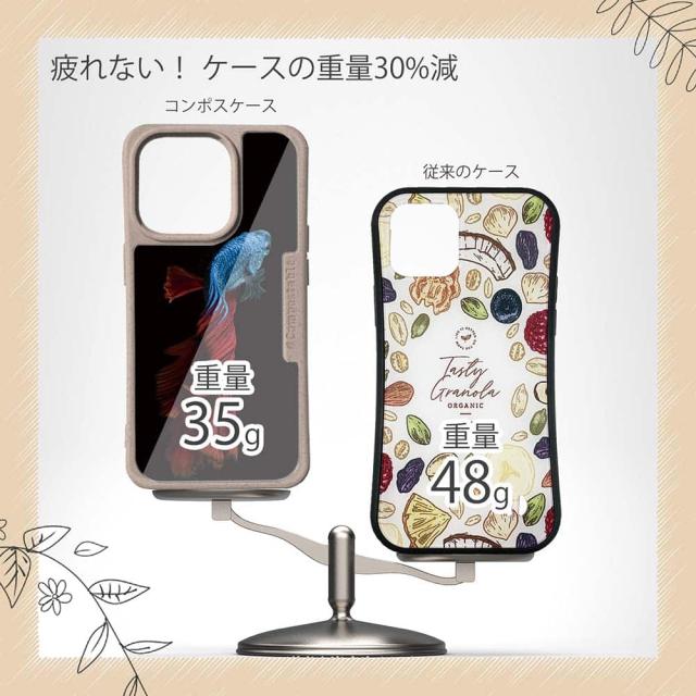 | ケースについて | 背面の内側に入れ込むデザインシートで、シーンに合わせて着せ替え可能。また、グリップしやすいクッション構造で、本体重量は約35gと軽減化を実現。さらに衝撃に強いSライン形状、究極に押しやすいボタン設計(切り込みが入ることで押し込む力を軽減)、背面のカメラ・レンズを保護する高さ設計となっております。生分解性プラスチック素材ながらも着脱もしやすく、割れない・指紋防止加工を施しています。 |