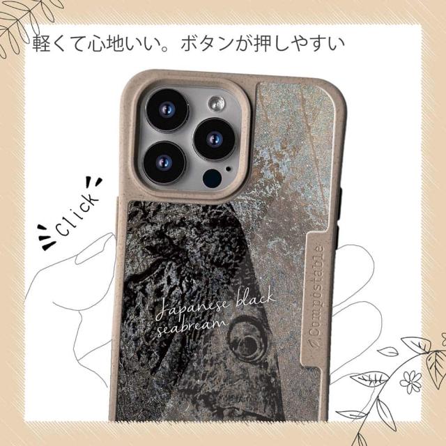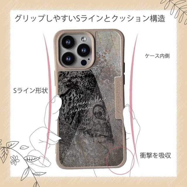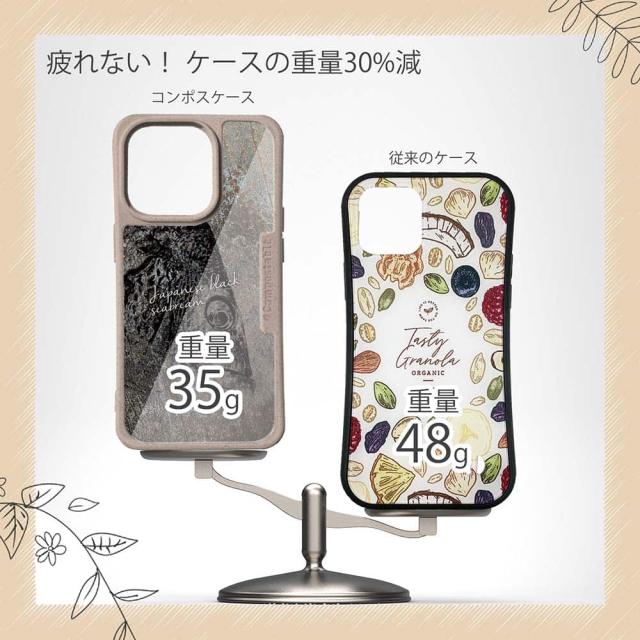 | ケースについて | 背面の内側に入れ込むデザインシートで、シーンに合わせて着せ替え可能。また、グリップしやすいクッション構造で、本体重量は約35gと軽減化を実現。さらに衝撃に強いSライン形状、究極に押しやすいボタン設計(切り込みが入ることで押し込む力を軽減)、背面のカメラ・レンズを保護する高さ設計となっております。生分解性プラスチック素材ながらも着脱もしやすく、割れない・指紋防止加工を施しています。 |